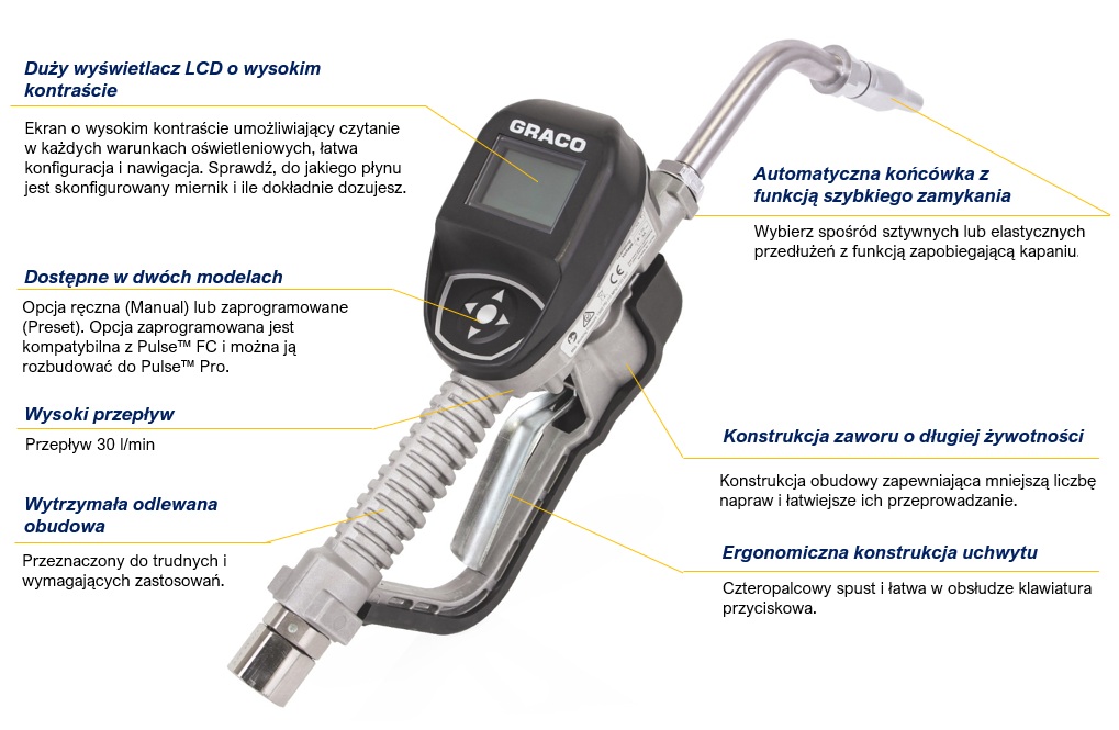 Pistolet dozujący ciecze – serii SDM8 GRACO – liczniki do pomiaru przepływu cieczy np. oleju, oleju przekładniowego, płynu chłodniczego, smaru i płynu do szyb.